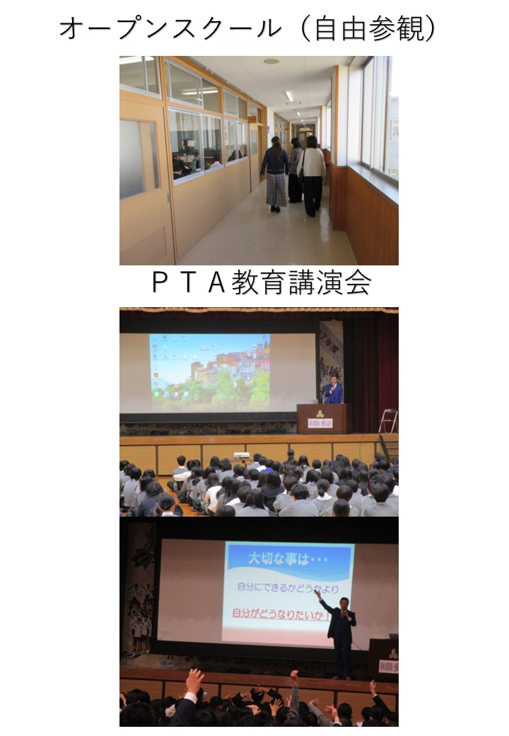 「滋賀教育の日」の協賛事業として、オープンスクール(自由参観日)とPTA教育講演会を行いました。授業参観には60名程度の保護者の方が来校され、子どもたちの学ぶ様子を見ていただきました。また、午後からのPTA教育講演会では、近畿医療専門学校創立者の小林秀健先生の講話を全校生徒と希望する保護者が聴きました。