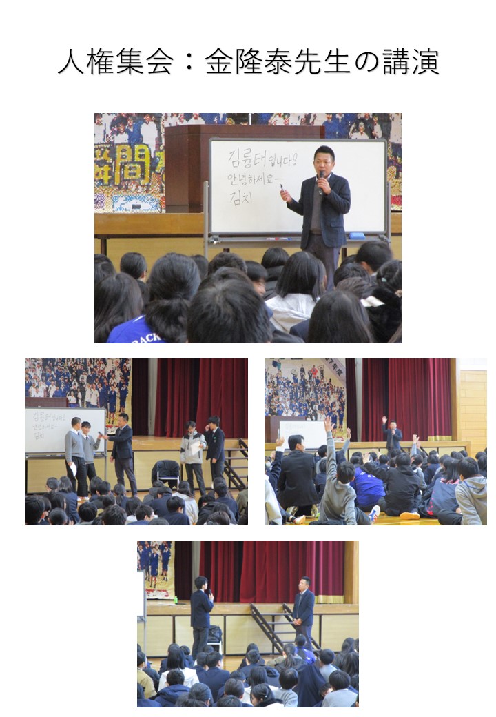 朝桜中学校の生徒全員が安心して安全に学校生活が過ごせるように、自分たちが生活している社会の中の人権に関する課題を明らかにして、人権意識の高揚を図る機会とするため実施しました。今年は、講師に滋賀朝鮮学園の金隆泰先生を招いて、生徒が「自分ならどうする?」という視点で自分事として考える場面を多く持てるような講演を拝聴しました。