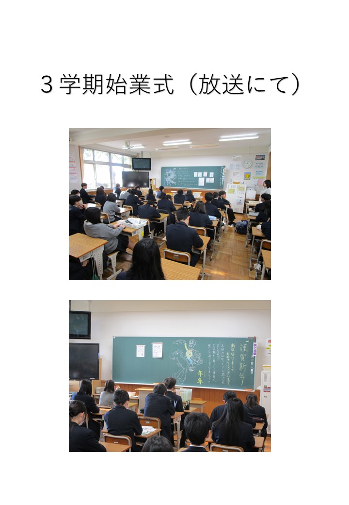 各学級では、生徒がしっかりと放送に耳を傾け、黒板には、新年に当たり学級担任からメッセージが書かれていました。