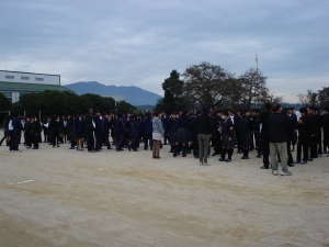 生徒は、地震により机の下で安全を確保し、揺れが収まってから運動場へ避難しました。
