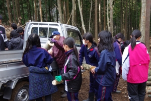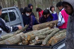 手伝いをいただきした。寒さの厳しい日でしたが、沢山の原木を学校に持ち帰ること