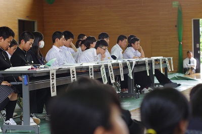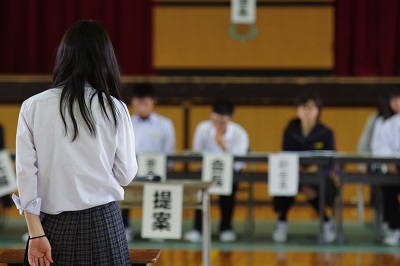 5月14日 生徒総会が行われました。今年度の生徒会本部や各事業部の活動方針について、質問や意見が出され、それに対して担当者からの回答の後、採決が行われました。そして、今年度の生徒会の活動内容が決定されました。また、9月に行われる体育祭の団抽選会もおこなわれ、1年から3年生までの団の組み合わせが決定しました。