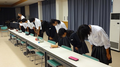 11月に行われる2年生の職場体験学習に向けての学習として、マナー学習が10月9日に行われました。講師の先生に指導していただき、実際に挨拶やお礼の仕方等、実際に、実習しながら学習が進められました。