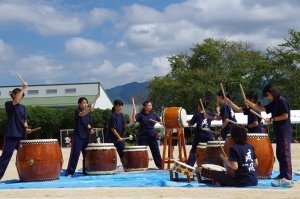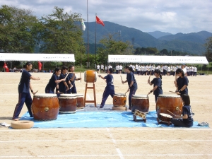 永源寺中太鼓『疾風』の力強い演奏、団アピール、生徒会種目(選抜綱引き・選抜リレー)、