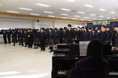 2学期終業式が行われました。校歌斉唱の後、学校長の話、表彰伝達、生徒指導より、冬休みの生活についての話がありました。学校長の話では目標をもって生活することの大切さを、2つのエピーソード交えて話していただきました。生徒指導では、携帯電話でのトラブル注意の話や、自転車に関わる道路交通法の変更について等話していただきました。