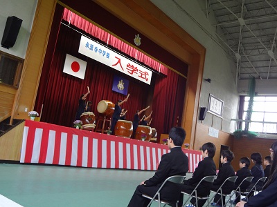 4月8日 永源寺中学校入学式が行われました。有志の太鼓「疾風の」演奏の後、本年度入学生との呼名、学校長