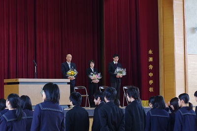 3月31日に離任式が行われました。永源寺中学校から3名の職員の方を送り出しました。