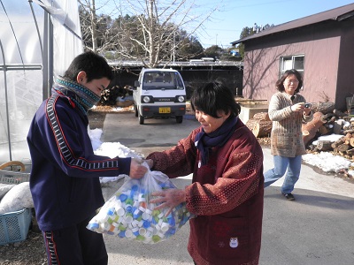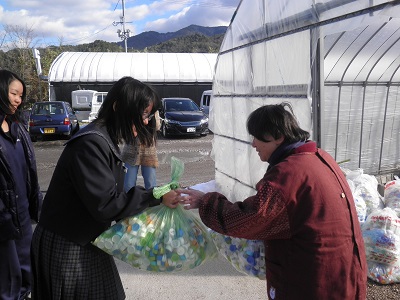 12月22日に、全校生徒にボランティア委員会から呼びかけて集めていた、7487個のペットボトルのキャップを、ボランティア委員会の代表生徒が、本校学区内にある、たけのこ共同作業所に届けました。このペットボトルは、東近江市に届けられ、社会福祉に役立てられる予定です。