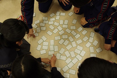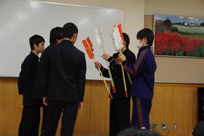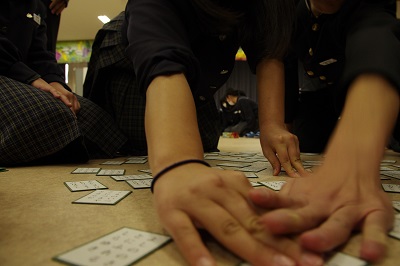 1月8日、生徒会本部が中心となって企画運営のもと全校カルタ会が行われました。6人程度のグループに分かれ対戦しました。また、終わりには体育祭で同じ団として取り組んだ1,2年生から3年生へ進路に向けての激励の一言が書かれたメッセージカードが羽根がわりにつけられている破魔矢が、各団の団長に渡されました。