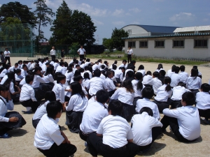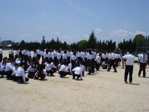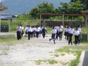 緊急地震速報後に両側の階段から順に運動場へ避難し、学級ごとに人員の安全確認をしました。