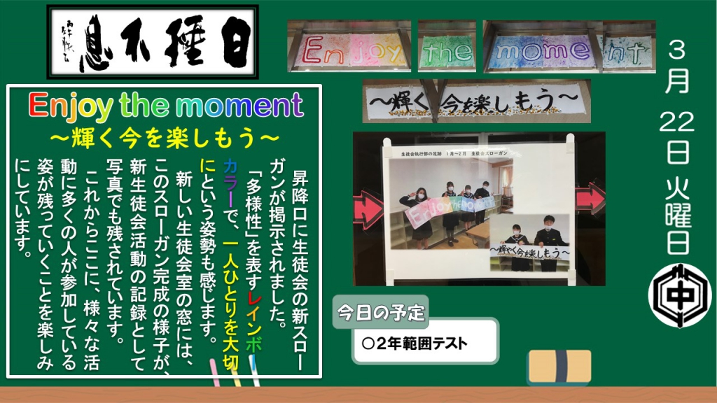 令和3年度3月まで、本校昇降口のディスプレイに、毎日、生徒向けに発信していたものです。 こちらから学校の様子を感じ取っていただければ幸いです。