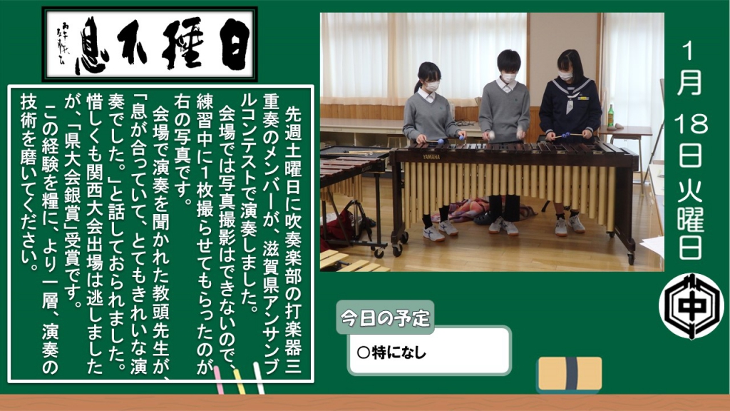 令和3年度3月まで、本校昇降口のディスプレイに、毎日、生徒向けに発信していたものです。 こちらから学校の様子を感じ取っていただければ幸いです。