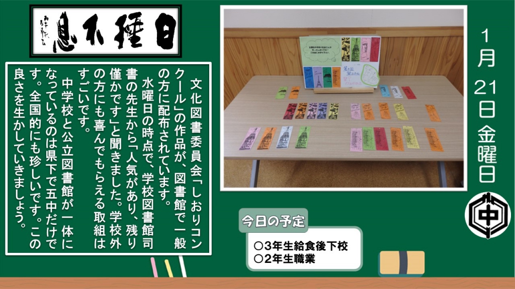 令和3年度3月まで、本校昇降口のディスプレイに、毎日、生徒向けに発信していたものです。 こちらから学校の様子を感じ取っていただければ幸いです。