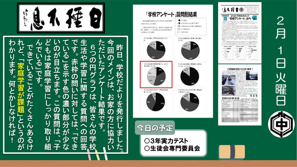 令和3年度3月まで、本校昇降口のディスプレイに、毎日、生徒向けに発信していたものです。 こちらから学校の様子を感じ取っていただければ幸いです。