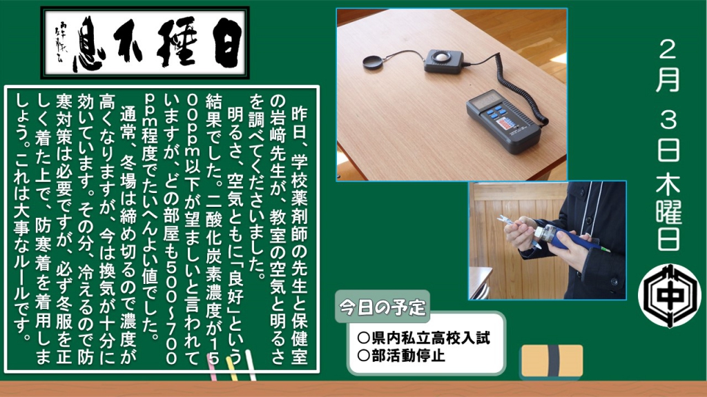 令和3年度3月まで、本校昇降口のディスプレイに、毎日、生徒向けに発信していたものです。 こちらから学校の様子を感じ取っていただければ幸いです。