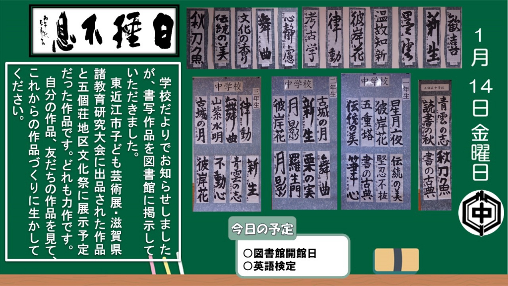 令和3年度3月まで、本校昇降口のディスプレイに、毎日、生徒向けに発信していたものです。 こちらから学校の様子を感じ取っていただければ幸いです。