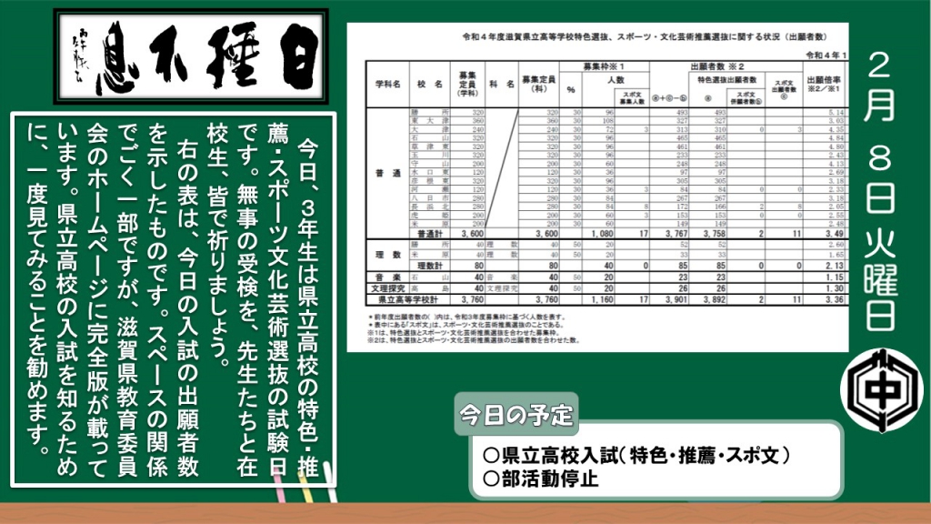 令和3年度3月まで、本校昇降口のディスプレイに、毎日、生徒向けに発信していたものです。 こちらから学校の様子を感じ取っていただければ幸いです。