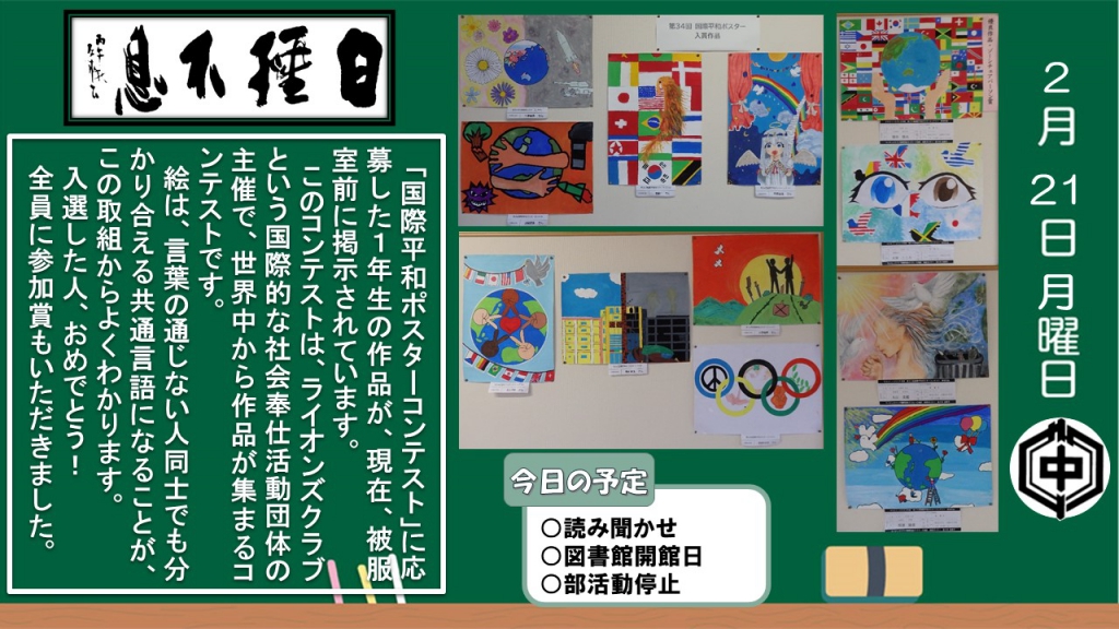 令和3年度3月まで、本校昇降口のディスプレイに、毎日、生徒向けに発信していたものです。 こちらから学校の様子を感じ取っていただければ幸いです。