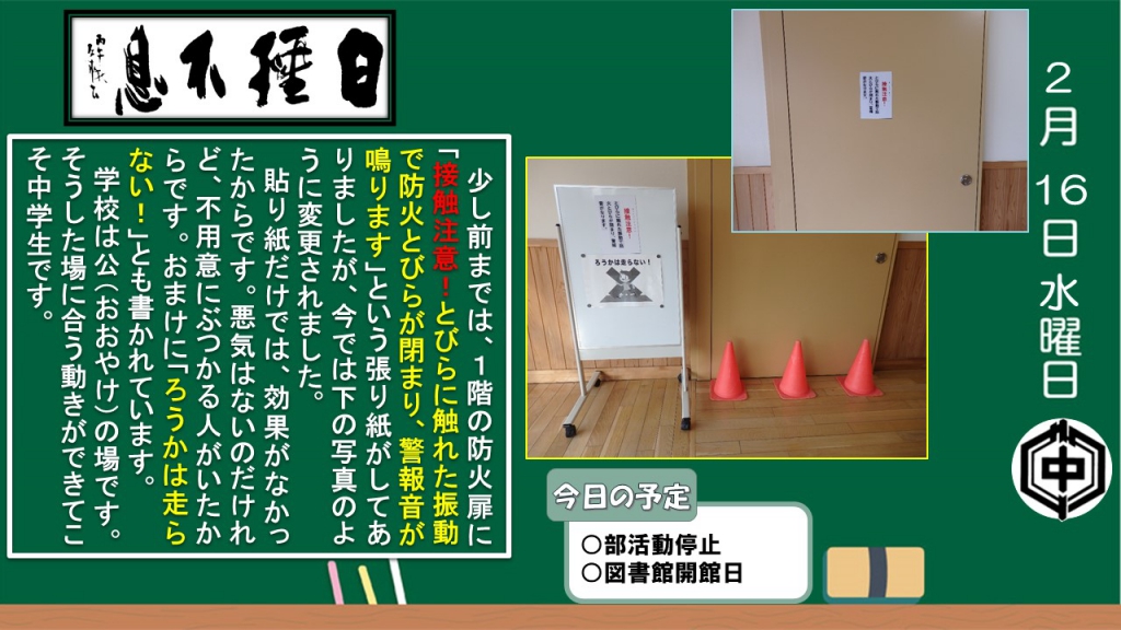 令和3年度3月まで、本校昇降口のディスプレイに、毎日、生徒向けに発信していたものです。 こちらから学校の様子を感じ取っていただければ幸いです。