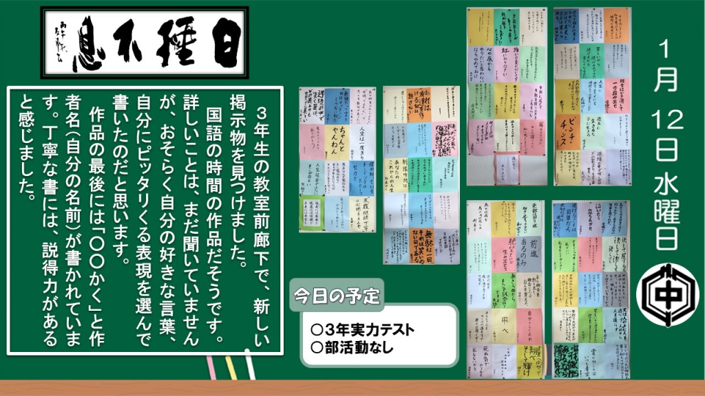 令和3年度3月まで、本校昇降口のディスプレイに、毎日、生徒向けに発信していたものです。 こちらから学校の様子を感じ取っていただければ幸いです。