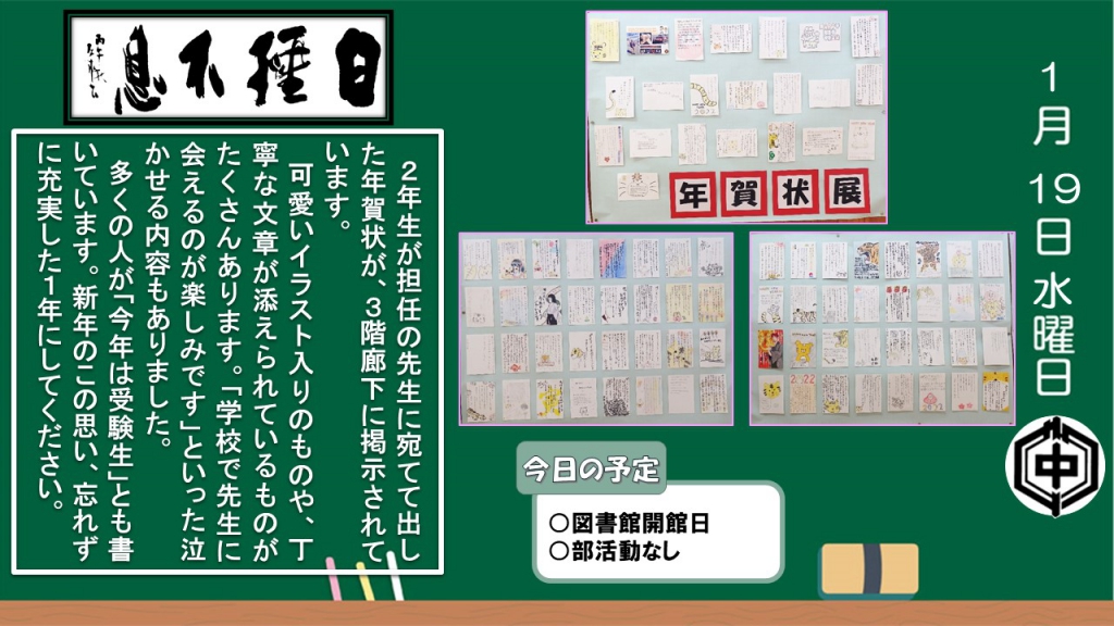 令和3年度3月まで、本校昇降口のディスプレイに、毎日、生徒向けに発信していたものです。 こちらから学校の様子を感じ取っていただければ幸いです。