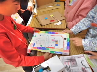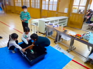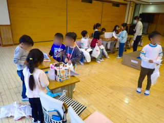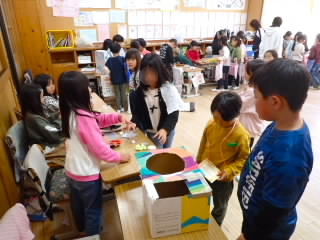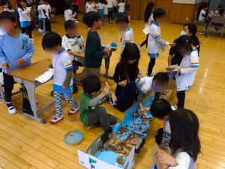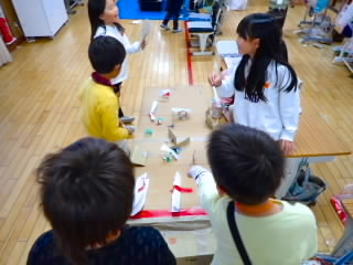 2年生では、1年生を招待しておもちゃランドを開きました。的あてゲームや磁石迷路、ヨットレースなど、先日自分たちだけで開いたおもちゃランドで使ったおもちゃを、よく飛ぶようにゴムを増やしたり、ゴムの巻き数を増やしたり、テープで紙コップを強力にしたりと改良しもっとおもしろくなるよう工夫していました。