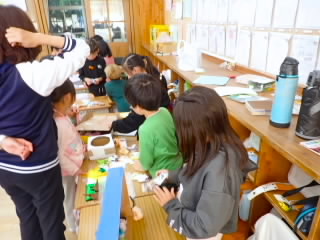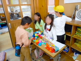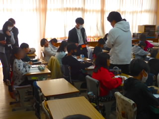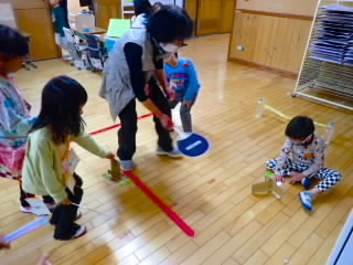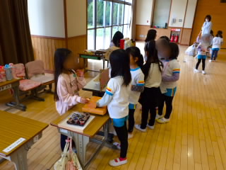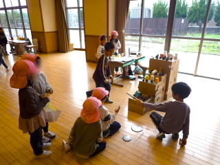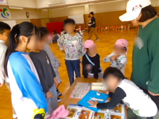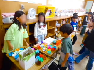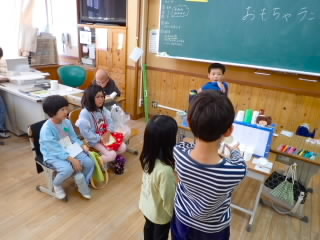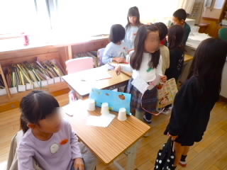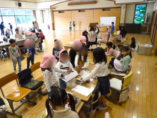 11月11日、18日、19日、1年生が学級ごとに、あさひ・あじさい・さくらんぼ幼児園の5歳児を招いて、交流をしました。「あきまつり」と称して子どもたちが工夫して作ったおもちゃランドです。最初にチームごとに作った遊びの紹介やルールを説明し、そのあとコーナーに分かれ、説明をする人、呼び込みをする人などの役割を真剣に行っていました。幼児園の子どもたちは、的あてゲーム、クレーンゲーム、モグラたたきゲームなどの遊びをたくさん楽しんでくれ、1年生はとても満足気でした。