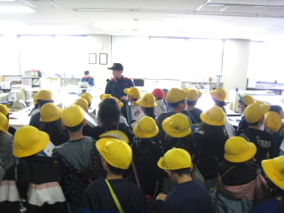 1年生は学級ごと3つに分かれて3か所で、交通安全教室を行いました。ふれあい広場では東近江警察署の方がアニメを見せながら、道路での危険を教えてくださいました。体育館では市役所の方が、実際の写真を見せながら交通安全の約束をお話ししてくださいました。道路では、警察官の方の指導をいただきながら、横断歩道を渡り、歩道を歩きました。アニメ等をとおして、特に見通しの悪いときは、覗き込んで車が来ていないか確認するなど、十分に注意しなければならないことがわかりました。