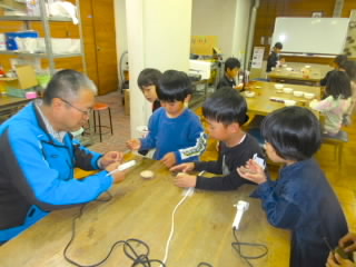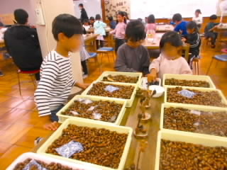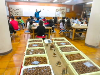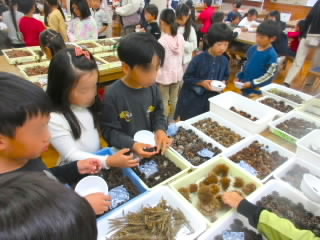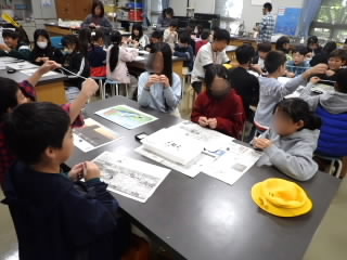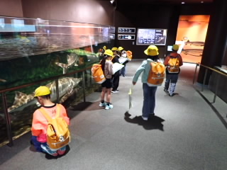 4年生の校外学習は琵琶湖博物館です。シジミストラップ作りでは、シジミにストラップをはさみ、殻の間にパテを入れて固定しました。仕上げにマニキュアを塗るととても美しい貝殻になり、いいお土産ができました。博物館の見学は、昔のくらし展示室と水族がおもしろかったようです。水槽に張り付いて食い入るようにずっと観察している子もいました。