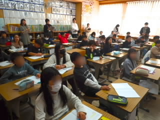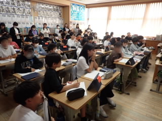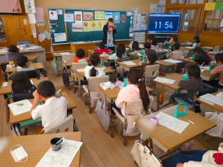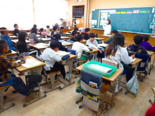 6年生では、金堂まちなみ保存会の方をゲストティーチャーに招き、お話を聞きました。ドラマなどのロケ地にもよく使われる金堂の町は、建て替えをしたり、リフォームしたりするのに、いろんなきまりがあるそうです。保存会の方々が月に2回会議を開いて、話し合いを行いどんな建物にするのか条例などと照らし合わせながら方向性を決めていくとのことでした。金堂へ行くと美しい町並みに圧倒されますが、裏ではたくさんのご苦労をされていることがわかりました。