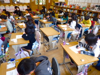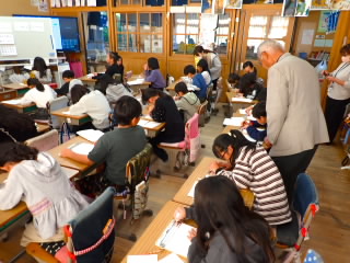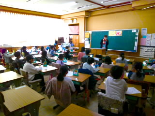 1時間目の1年生の教室にほんの少しだけおじゃましました。算数のテスト、算数の授業、国語の授業をそれぞれしていました。テストはみんなだまって真剣でした。授業は国語も算数も積極的に手を挙げて発表しようとしていました。2年生は、大切に野菜の苗を育ていています。朝学校へ来たら欠かさず水やりをしています。育てているのはナスやトマト、キュウリ、オクラです。オクラを育てるのはなかなか難しいようです。