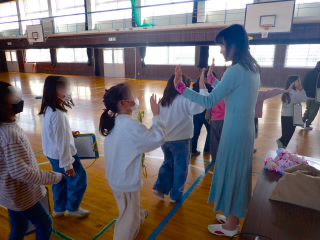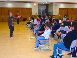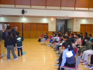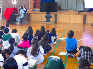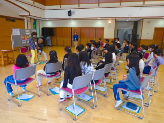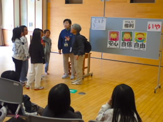 3年生では、総合的な学習の時間に目の不自由な方を講師にお招きしてお話を聞きました。まずは、普段見えている目が見えなくなることがどんなに不便で怖いことなのか体験するために、アイマスクをして白杖を持ち、友だちに手を引いてもらいながら体育館の中を歩きました。途中、マットが敷いてあったり、踏切板が置いてあったりと、気をつけなければならない箇所がありましたが、手を引く子が声をかけ、恐々歩いていました。その後、講師の方のお話を聞きました。目が見えなくなって不安だったとき、やる前から無理だとあきらめないで、なんでもチャレンジすることで前向きになれたというお話は子どもたちの心に響いたようでした。目が見えなくなってから始められた、ピアノや踊りを見せていただき、終わったあとは子どもたちの拍手喝采でした。