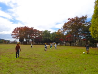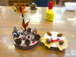 1年生は校外学習で希望が丘文化公園に行きました。あいにくの雨でしたが、大ホールでドッジボールをする班、クラフト工作をする班の前後半に分かれて楽しみました。クラフト工作では、木の板にボンドやクルーがんで、ドングリや落ち葉をつけ、秋を感じる作品を作りました。材料をたくさん準備してくださっており、子どもたちは目を輝かせながら選んでいたようです。