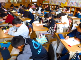 先日、八日市点訳サークル「燈火」の方々に来ていただき、3年1組だけ点字を打つ体験をしましたが、今日は2組と3組が点字体験をしました。点字の歴史を学んだあと、学校名や自分の名前を点訳しました。点字を打ち始めると、やはり感触が気持ちいいようで黙々と点訳する子が多かったです。