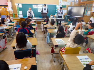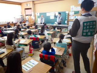 2年生は、東近江市さわやか環境づくり協議会の方にお越しいただき、「小2エコクラブ」学習をしました。学習では、「混ぜればごみ、分ければ資源」というキャッチフレーズを教えていただき、ペットボトルの分別方法や廃食油のリサイクルを知りました。廃食油からはバイオディーゼル燃料の他に、上靴の汚れもよく落ちる石けんも作られており、お土産として石けんをいただけることを知ると子どもたちは、ガッツポーズをして喜んでいました。