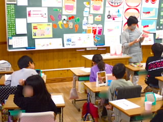 1年生で歯科衛生士さんをお招きし、歯科指導をしていただきました。ジュースやお菓子はたくさん砂糖が入っていて虫歯になりやすくなることや、汚れを落とす歯磨きの仕方を教えていただきました。学習の後、子どもたちは、「歯磨きを丁寧にする」「砂糖が入っている食べ物を食べすぎない」「ジュースのかわりに牛乳を飲む」などの感想を書いていました。