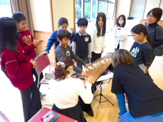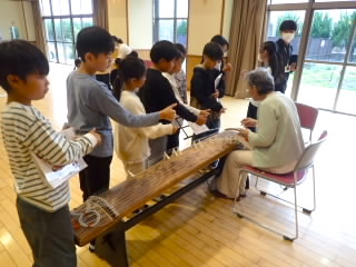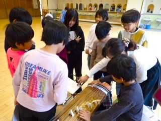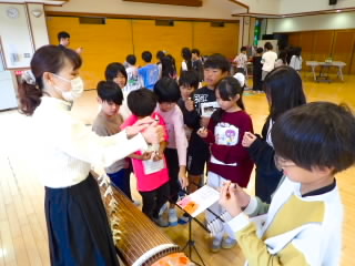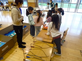 4年生では、カナリヤ楽器から講師を4名お招きしてお琴体験をしました。琴は「桐」でできていて2000年以上前につくられたことや、13本の糸が張ってありもともと絹の糸だったものが、テトロンと呼ばれる素材にかわったことなどを教えていただきました。そのあと、グループに分かれ、一人ずつ「さくら」の演奏を教えていただきながら行いました。けっこう強く糸をはじかないとなかなか良い音色にならないので難しそうでした。