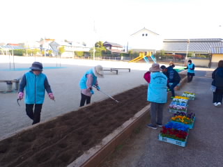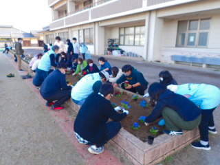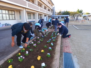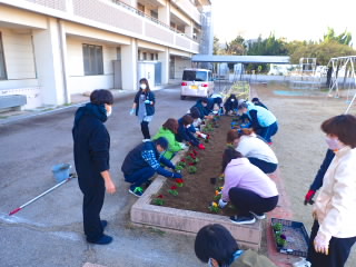 青少年育成市民会議環境部会の方々が「青少年にふさわしい環境づくりの推進」の一環として「花いっぱい運動」に取り組んでくださっています。今日は、学校にチューリップとパンジーをたくさん持って来てくださいました。本当なら環境美化委員会が地域の方と一緒に植えるはずだったのですが、それができなくてとても残念です。今日は、職員と青少年育成市民会議の方々とでたくさんの苗を植えました。さびしかった花壇が華やかになります。ありがとうございました。