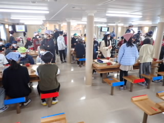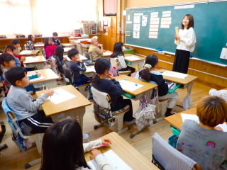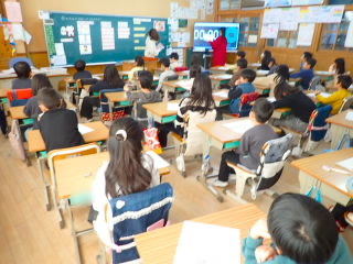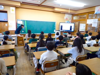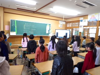 3時間目、1年1組はお誕生会で、係の子どもが中心になって紙飛行機飛ばし大会をしていました。3年3組は、算数で実際にはかりを使っていろんな物の重さを比べていました。5年、6年は課題が終わった子どもからタブレットの歴史問題を解いたり、タイピング練習をしたりしていました。4年3組は総合的な学習の時間に調べた地域の自慢の発表をしていました。おばけ提灯は戦争で一時途絶えそうになったものを復活させ、今では冬のイルミネーションイベントにLED1万球と一緒に飾られることを発表した班や、近江商人は教育熱心で、五個荘では70%が算術を学んでいたことを発表した班などよく調べられていて、勉強になりました。