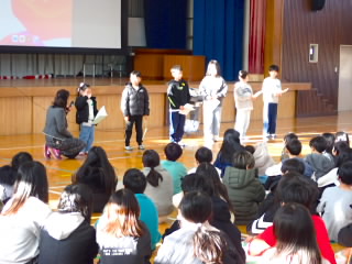 早朝から、校門に「商工戦隊アカレンジャイ」が来てくださいました。商工会青年部の方々です。突然のコスプレ衣装に子どもたちは、みんな笑顔になって登校できました。アカレンジャイはとても薄着なので「寒い寒い」と言いながら、子どもたちにあいさつしてくださっていました。子どもたちの一瞬の笑顔のためにここまでしてくださって本当にありがとうございます。