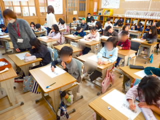 4年生が書初めの練習をしていました。「一歩」「赤い実」「七草」「やる気」など新年にちなんだ字を書きます。たっぷり墨をつけ一気に書き上げるのでのびのびした気持ちの良い字が書けていました。
