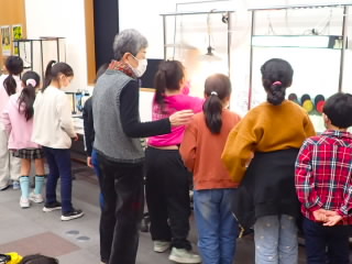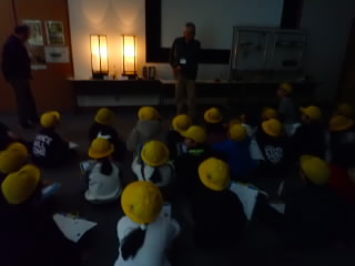 3年生は能登川博物館で昔のくらしを体験しました。「灯り」体験では、ろうそくの灯りから、LEDの灯りまで、実際に部屋の灯りを消して体感しました。行燈の灯りはとても暗く、子どもたちは、よく昔の人たちはこんな暗いところで本が読めたなあと感じていました。火おこし体験では、七輪の中に、新聞、落ち葉、炭と重ねて、マッチで火をつけました。うちわや竹筒で風を送ると、火は強くなりますが煙がすごく、子どもたちは四苦八苦していました。