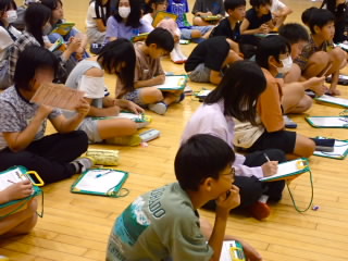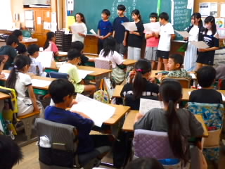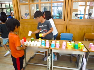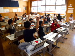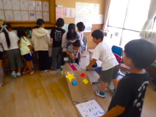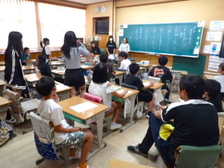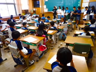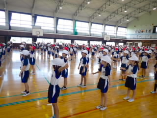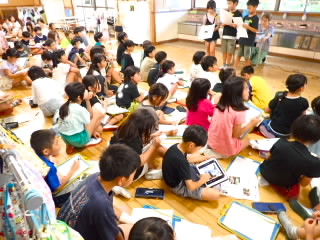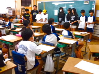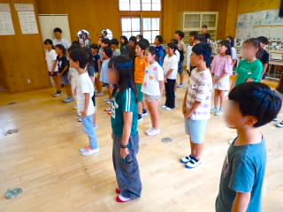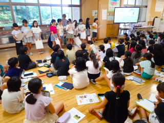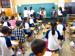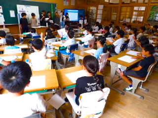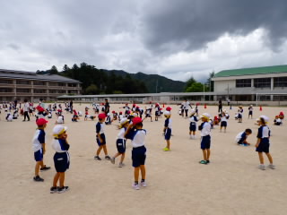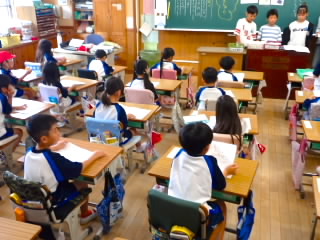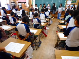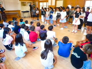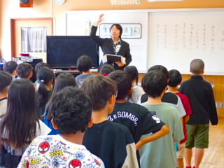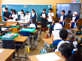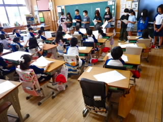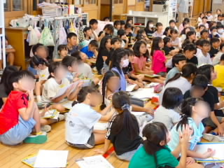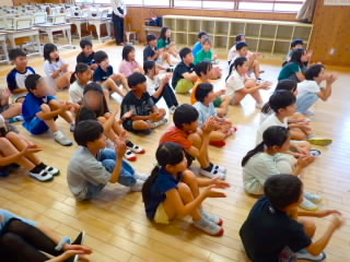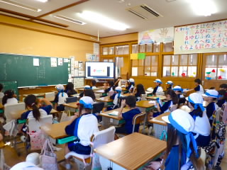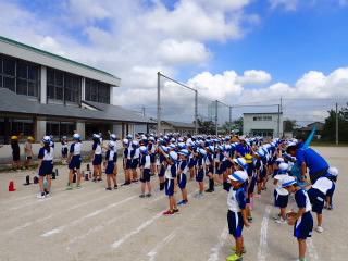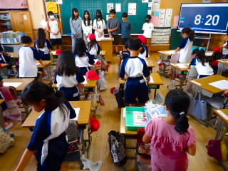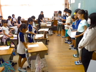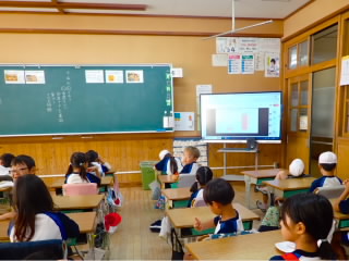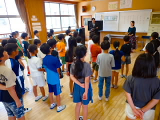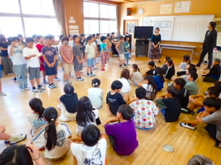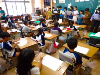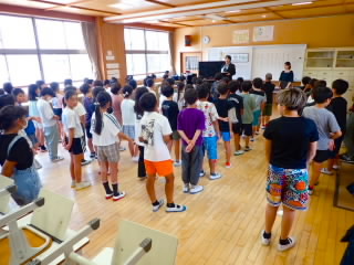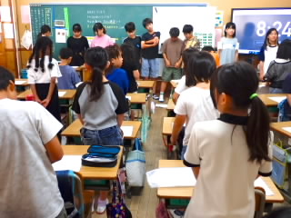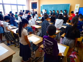 始業式 長い夏休みも終わり、子どもたちの楽しみがたくさん詰まった2学期が始まりました。それぞれの教室には、2学期を楽しんで過ごせるように、担任の先生の工夫した板書が描いてありました。始業式では二つのことを話しました。一つめは何にでも、楽しみながら一生懸命取り組んだ方が成長すること。1学期のようにたくさん成長して先生たちを驚かせてほしいと話しました。二つめは感謝の気持ちを持つこと。国スポ障スポの選手たちでも、オリンピックの選手たちでも終わった後のインタビューでは、必ず「周りのみなさんの支えがあったから」と言うことを例に挙げ、金メダルをとった選手でも感謝の気持ちを忘れないので、みなさんも家族や地域の方々に感謝の気持ちを込めて朝のあいさつをしましょう、というお話をしました。始業式のあとは、夏休みの思い出ビンゴをしたり、学級目標を確認したりするなど、2学期の良いスタートができました。