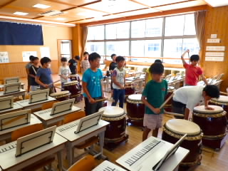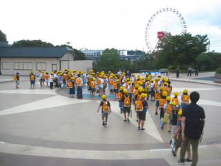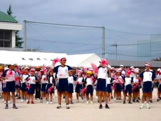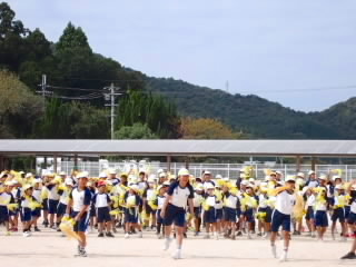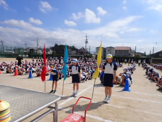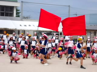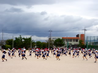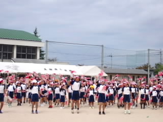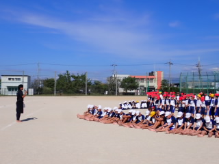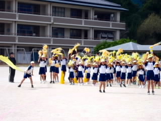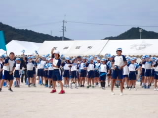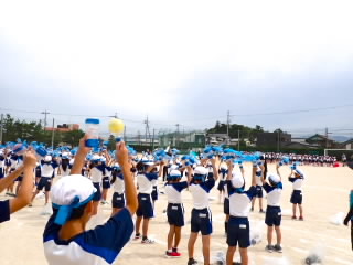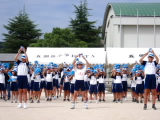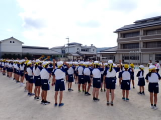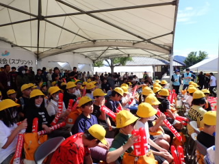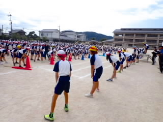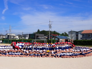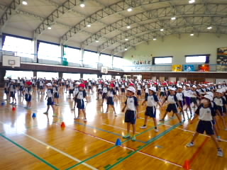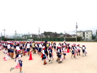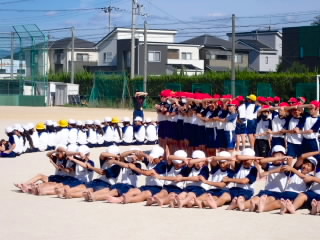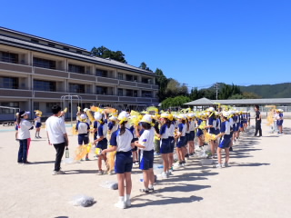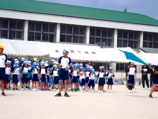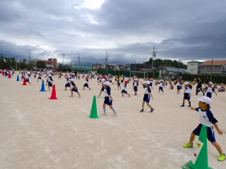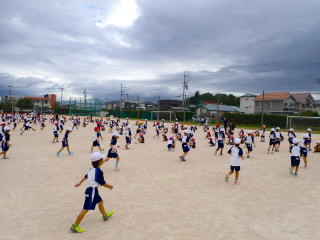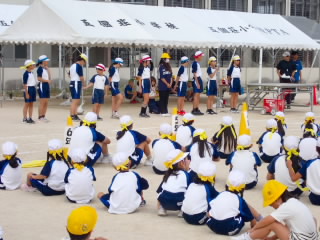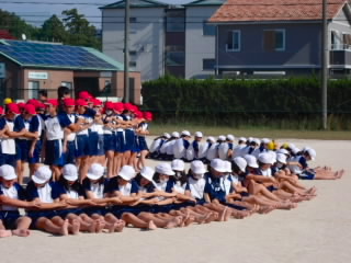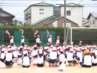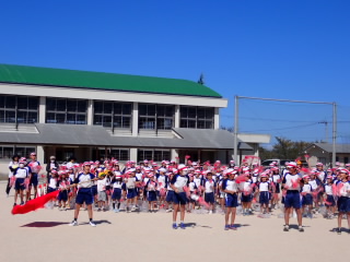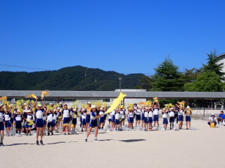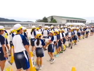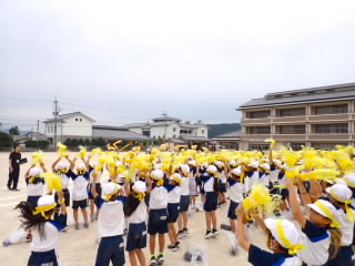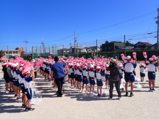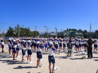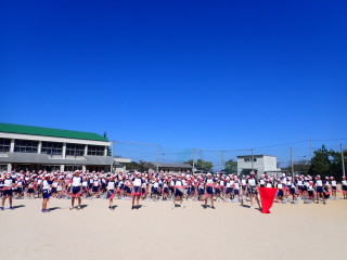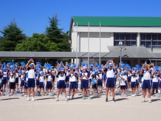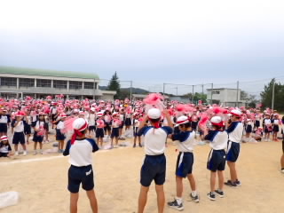 今まで、各教室で練習してきた応援を、今日初めて全体で集まって合わせました。各色とも、ペットボトルとタフロープを使って、応援グッズを作っていますので、とても華やいで見えました。6年生と5年生の応援団が中心になり、下学年に丁寧に教えながら進めていく姿はとても頼もしかったです。