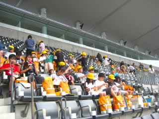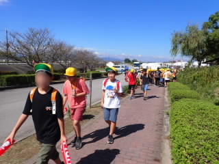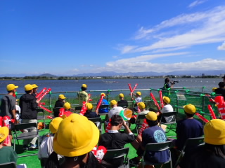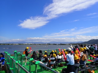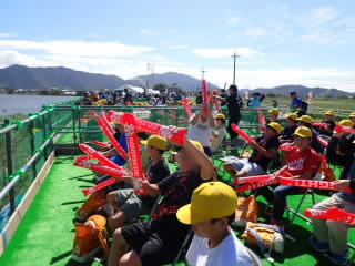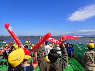 6年生が国スポ「カヌー競技」の応援に伊庭内湖へ行きました。滋賀県の選手が出場するときは、周りの観客の方が教えてくれるので、赤色の風船で一生懸命応援していました。運動会の応援合戦の練習をしていることもあり、大きな声で応援できていました。