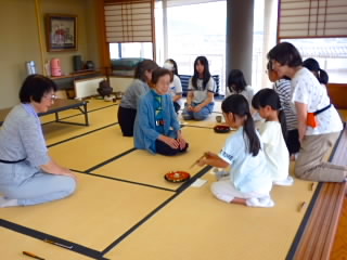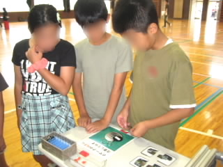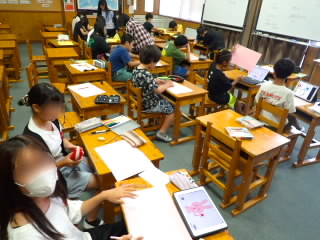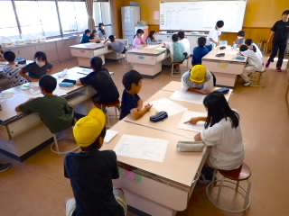 6年生では能登川埋蔵文化センターの方を招いて、縄文・弥生のくらしを教えていただきました。五個荘にも百々矢古墳、丸山古墳、山の神古墳、川並里中遺跡など多くの古墳が残っていることを知りました。古墳からは、木のくわや土器、矢じり、勾玉などが出土しているそうです。火起こし体験では、班のメンバーで交代しながら火起こし器を回しました。最初のクラスは汗だくになりながら回し、煙を出すだけでも苦労していましたが、二番目のクラスからは、木が乾いてきたのか最初より簡単に煙が出ていました。残念ながら火をつけるまではいきませんでした。