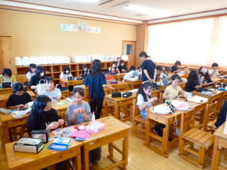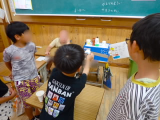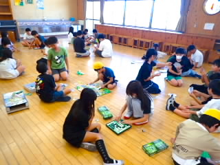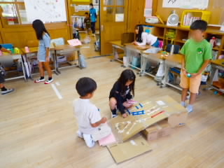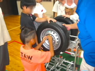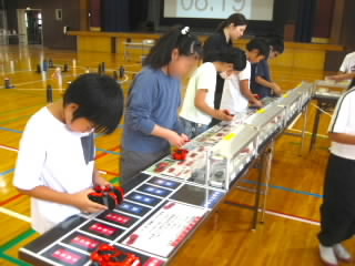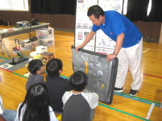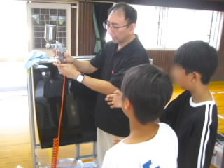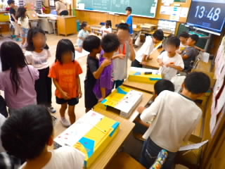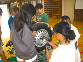 5年生はダイハツの出前授業「ダイハツものづくり体験」で、自動車工業について学びました。学習は4つのグループに分かれ、ローテーションで行いました。塗装チームは、エアスプレーガンで、塗料の代わりに水をムラがないよう車に吹き付けました。タイヤチームは、インパクトレンチを使ってタイヤを取り付けました。プレスチームはプレス機で缶バッチを作りました。組立てチームは、レゴを使って流れ作業とはどういうものか体験しました。実際に体を動かして学ぶ学習は、机上で学ぶよりしっかりと心に残ると思います。