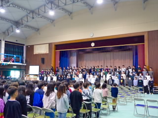 全校の子どもたちが6年生にお礼の気持ちを伝えるための、卒業おめでとう集会を行いました。学年ごとにありがとうの気持ちを込めた練習の成果を6年生に見てもらいました。4年生は歌声に合わせた書道パフォーマンス。大きな歌声に自然と全校から手拍子が湧いていました。1年生は呼びかけと合奏。とても大きな声で呼びかけ、大きな卒業証書を6年生に渡しました。2年生は、タイムスリップして6年生が経験してきた運動会の踊りや音楽会の演奏を披露しました。6年生からは「あー、やったよなあ」と声が上がっていました。3年生も6年生が今までやってきた、よさこいソーランや音楽会での歌などを再現しました。合唱「マイバラード」は6年生も一緒に口ずさんでいました。5年生は演奏に合わせて思い出のスライドショーを作っていました。6年生は懐かしさに写真が変わるたび歓声をあげていました。6年生が退場するとき5年生が「威風堂々」を演奏すると、「涙出そう」とつぶやいている6年生もいました。