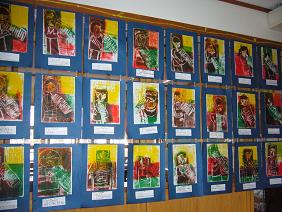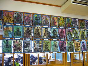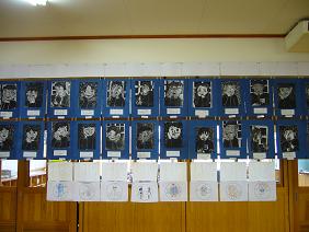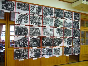 図画工作科の学習で版画を学びました。今、できあがった作品がワークスペースに