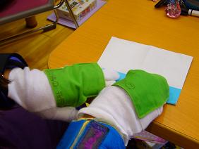 視野の狭くなる眼鏡をつけて新聞を読んでみたり、手におもりをつけて折り